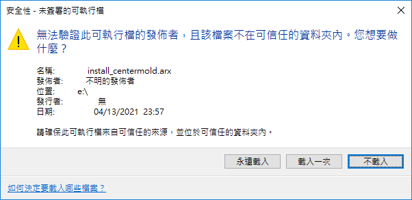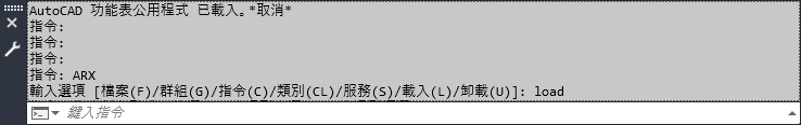 啟動 AutoCAD,輸入 ARX 指令,輸入 Load。開啟 install_CenterMold.arx 安裝程式