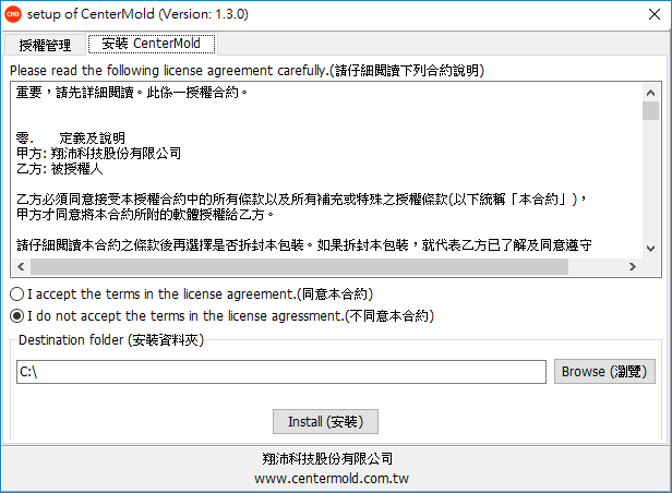 執行 setup_CenterMold.exe,登錄相關資料後儲存註冊檔,並將其 e-mail 至 centermold3d@outlook.com 或 center@centermold.com.tw,審核完成後會收到啟動檔