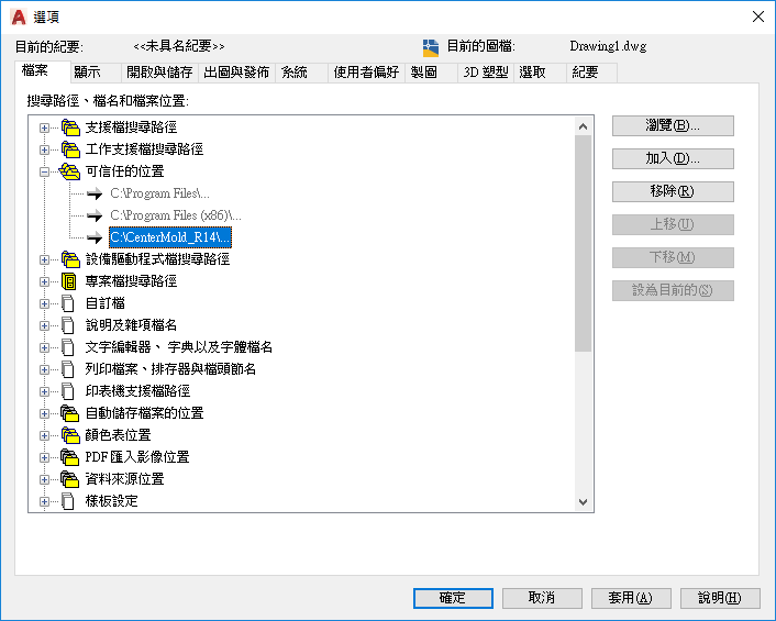 將 C:\CenterMold_R14\... 加入 AutoCAD 可信任位置,按確定。 (範例說明: CenterMold 安裝在 C:\CenterMold_R14)