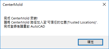 完成安裝後會顯示提醒視窗,提醒將 CenterMold 位置加入 AutoCAD 可信任位置