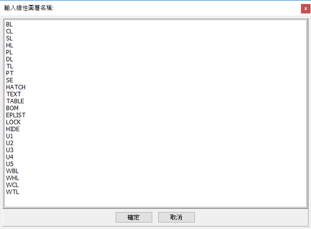 繪製線型直線 (粗實線,中心線,虛線。。。),線型圖層會設為目前圖層。 如有 PICKFIRST 選擇組時,選擇組物件的圖層會轉為線型圖層 (目前圖層不會變更) BLL 指令: 繪製粗實線 CLL 指令: 繪製中心線 SLL 指令: 繪製細實線 HLL 指令: 繪製虛線 PLL 指令: 繪製假想線 DLL 指令: 繪製尺寸線 XXL 指令: 繪製線型線 (指定要繪製的線型圖層) 執行繪製線型線時,顯示下列對話框